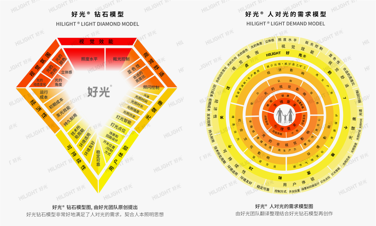 基于光对人的影响的理论研究、人本照明思想和为生活设计光的理念,我们提出了“好光钻石模型”,从7个维度28个关注点界定好光,用于在服务客户的过程中指导和检验我们的工作。